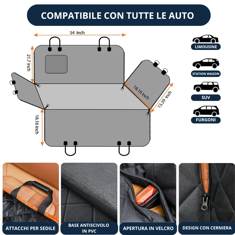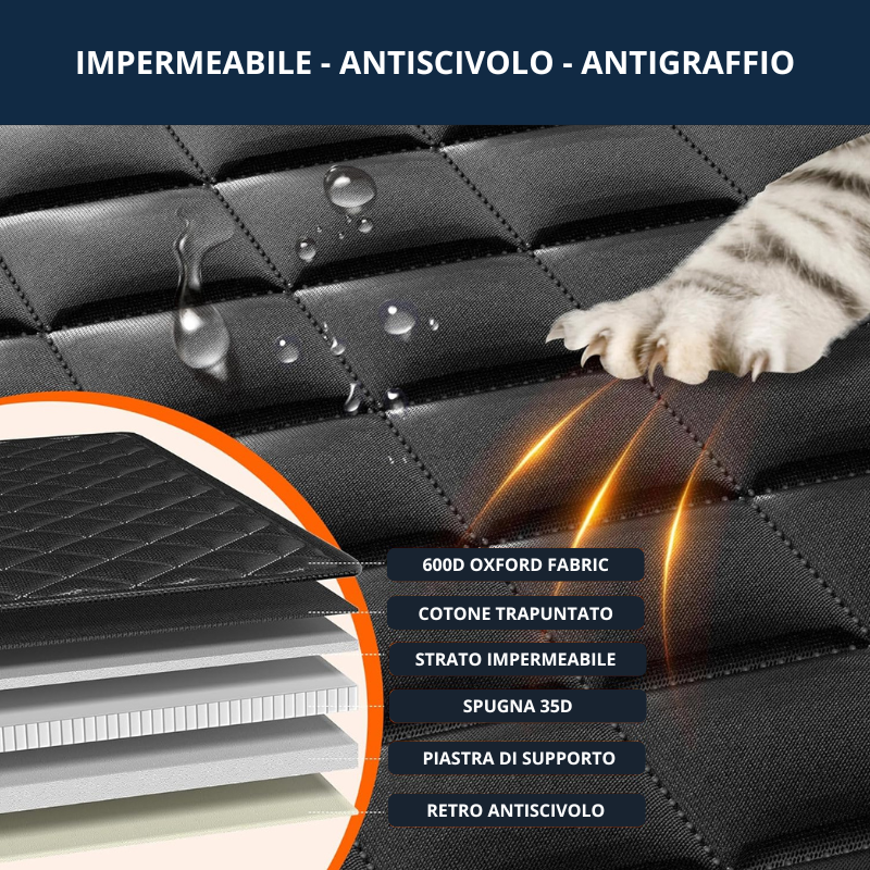 PROTEZIONE COMPLETA E MATERIALI RESISTENTI: Realizzato in tessuto impermeabile e antigraffio, protegge sedili, portiere e poggiatesta da peli, graffi e sporco