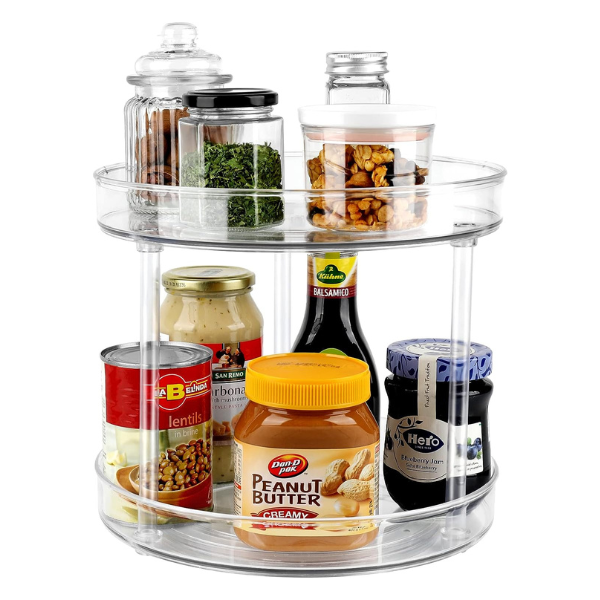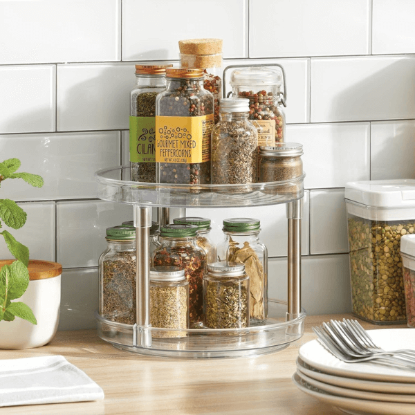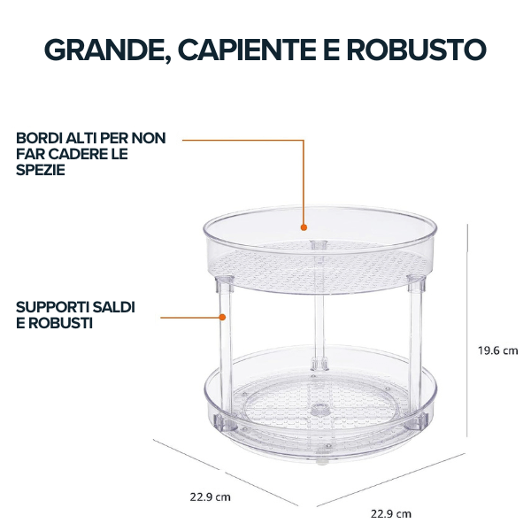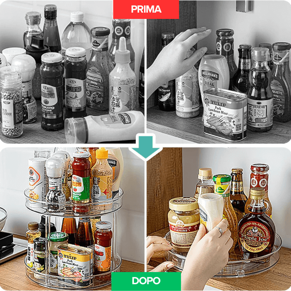Ecco, la soluzione esiste ed è il Nuovo Porta Spezie Rotante e Trasparente a 2 piani: